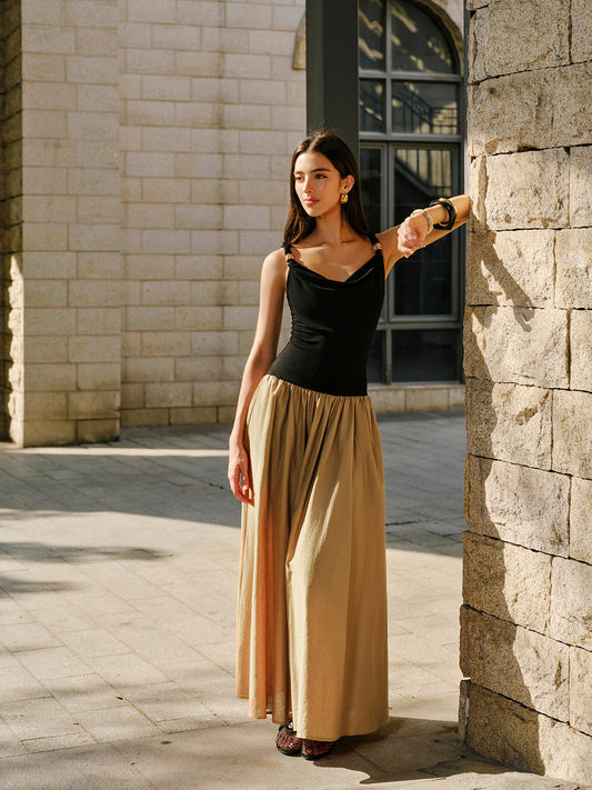 Renk Bloklu Halter Yaka Keten Karışımlı Elbise