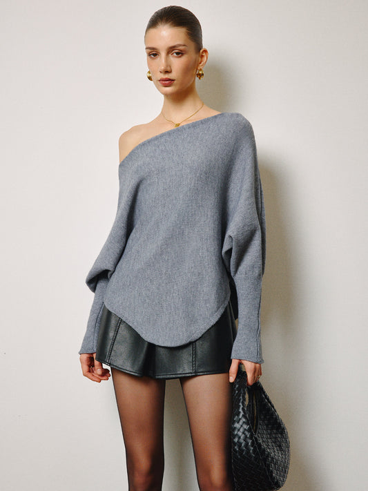 Oversize Asimetrik Yaka Kuzu Kollu Triko Kazak