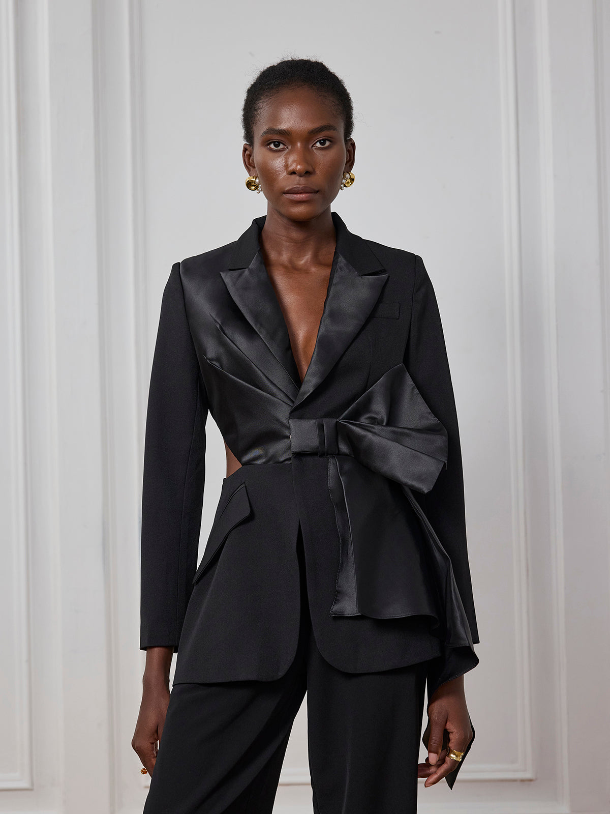 Alma Vücuda Oturan Dekolteli Fiyonk Detaylı Blazer, kendinden emin ve sofistike kadınlar için özenle tasarlanmıştır.