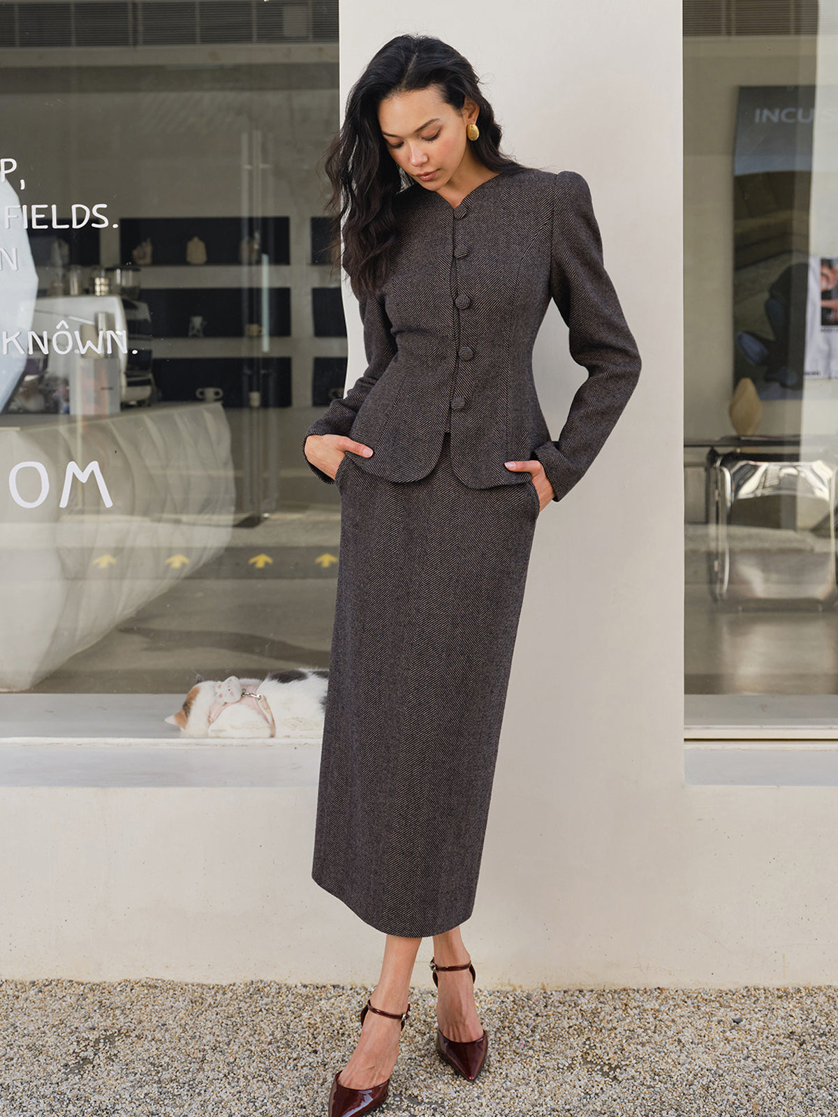 Şevron Desenli Yırtmaçlı Cepli Etek