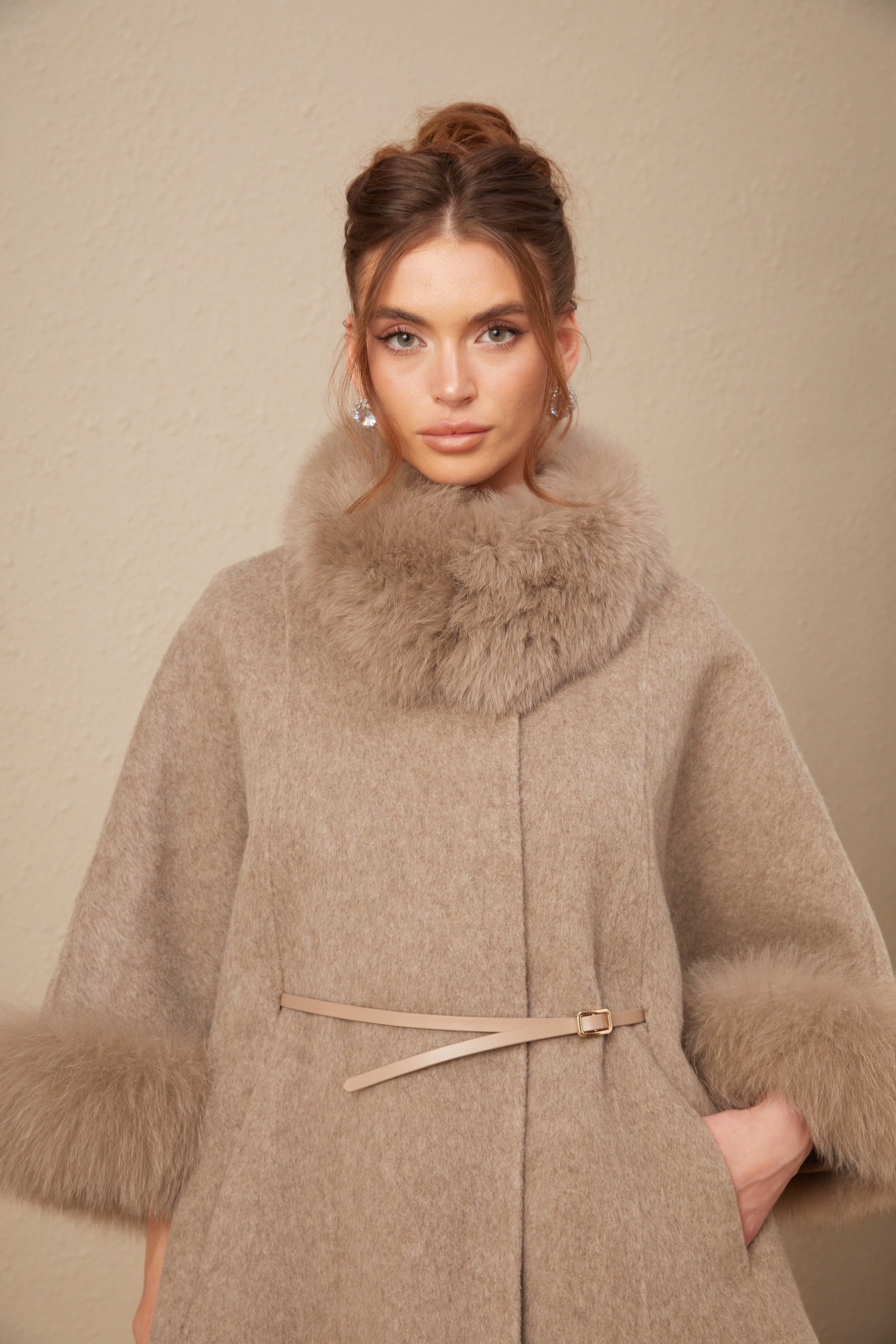 Chloris Yün ve Kürk Detaylı Kemerli Pelerin Ceket
