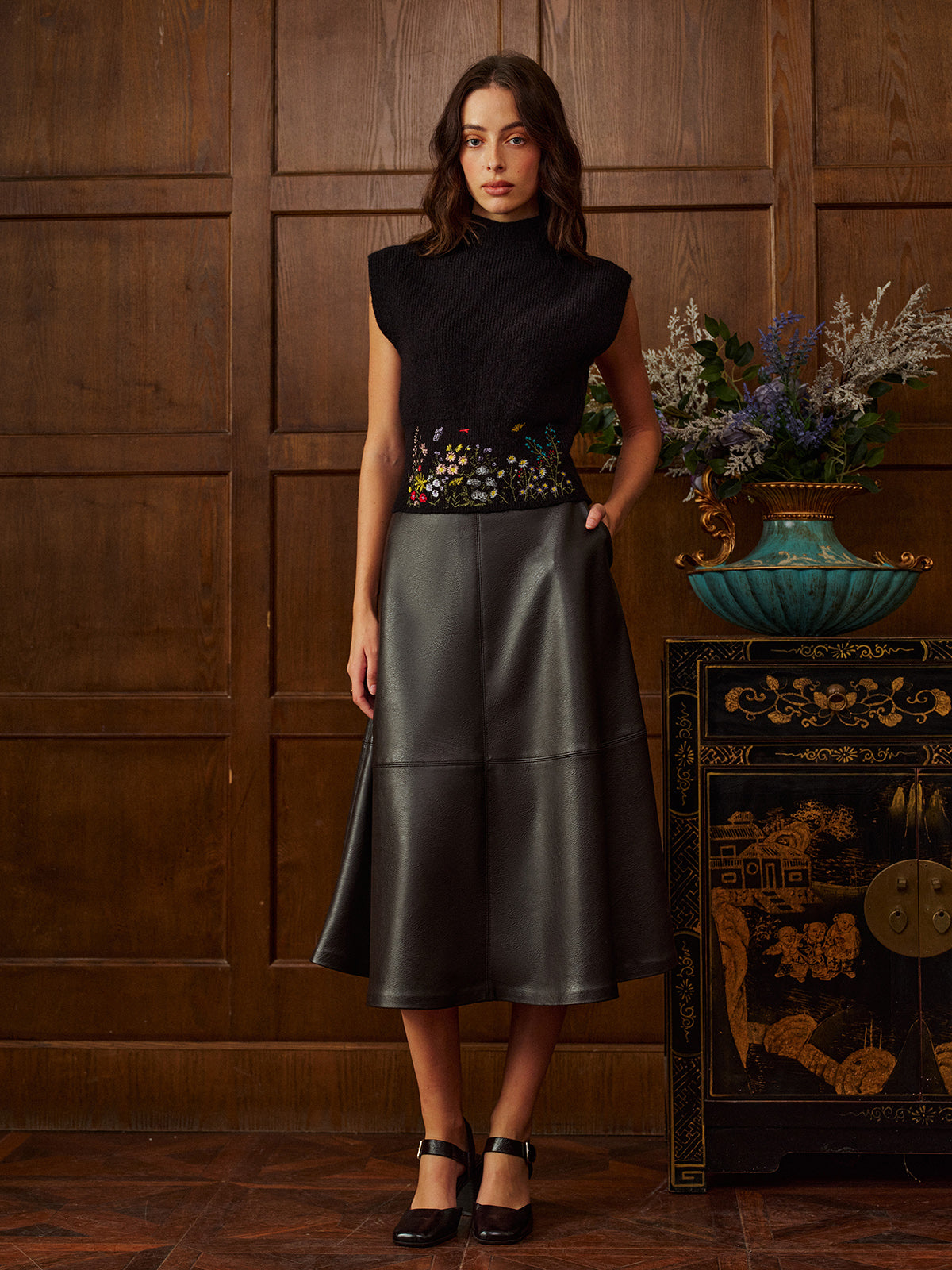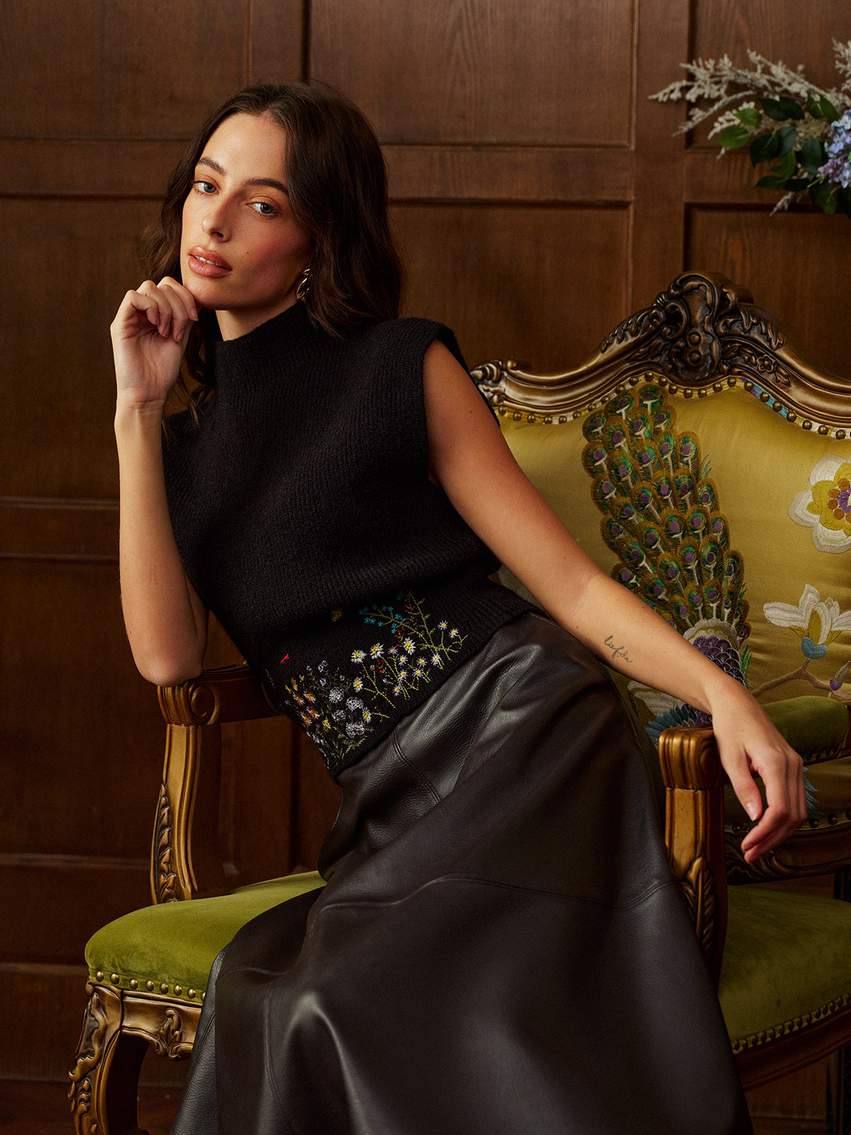 Dik Yaka Nakışlı Çiçek Desenli Triko...